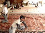 Once the weaving is completed, a final inspection is made and finishing touches are added to ensure a carpet of the highest quality. The carpet is turned over and each knot is individually pressed to provide a smooth, uniform finish on the backside. The carpet pile is then clipped by hand so that the carpet surface is even and smooth. The design is then trimmed by cutting the outlines of each color to give the pattern realize. |  |